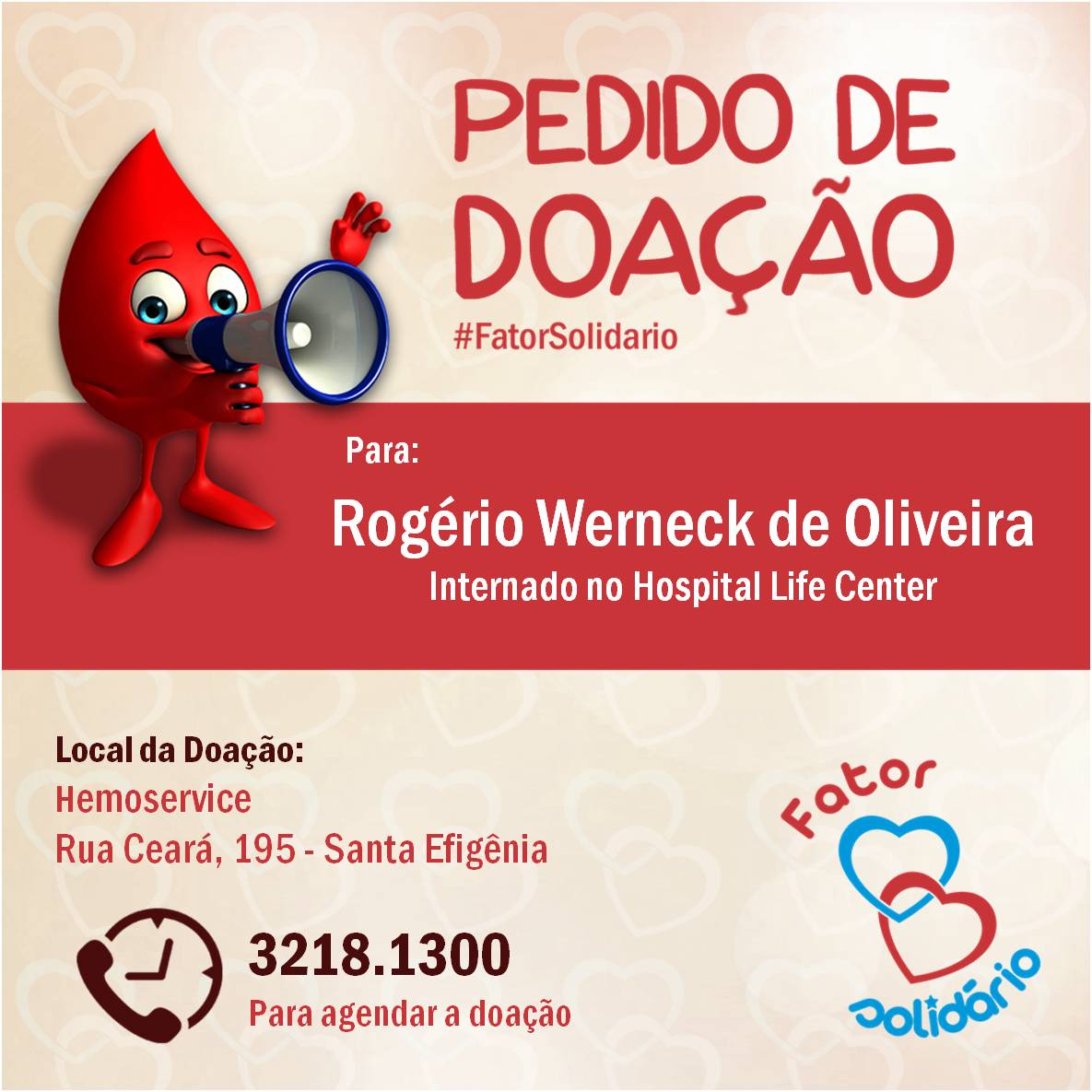 PEDIDO DE DOAÇÃO Amigos de Belo Horizonte, Vamos ajudar nosso irmão Rogério, ele precisa de doadores de sangue! Contamos com a ajuda de todos vocês!!!
